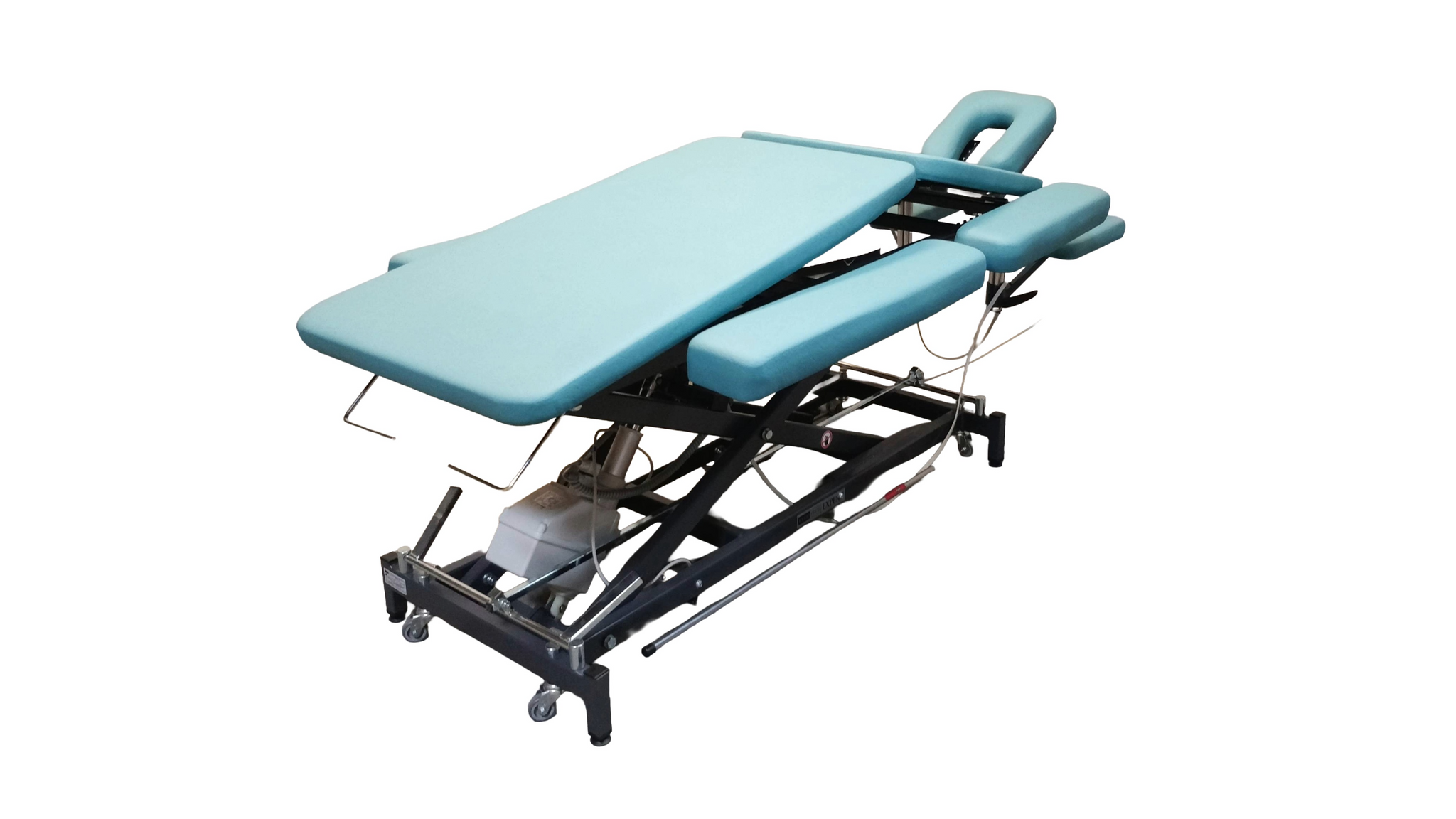 Elektrisk behandlingsbänk med motorlyft, manuell ryggdel och motoriserat midjelyft. Välj mellan 0, 2 eller 4 sidovingar. Bänken levereras med vitt, grått eller svart stativ och du kan välja mellan 9 färger på klädseln.
