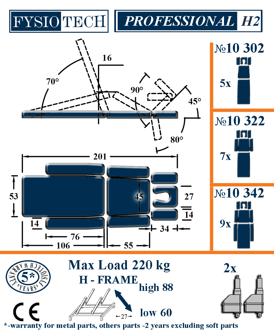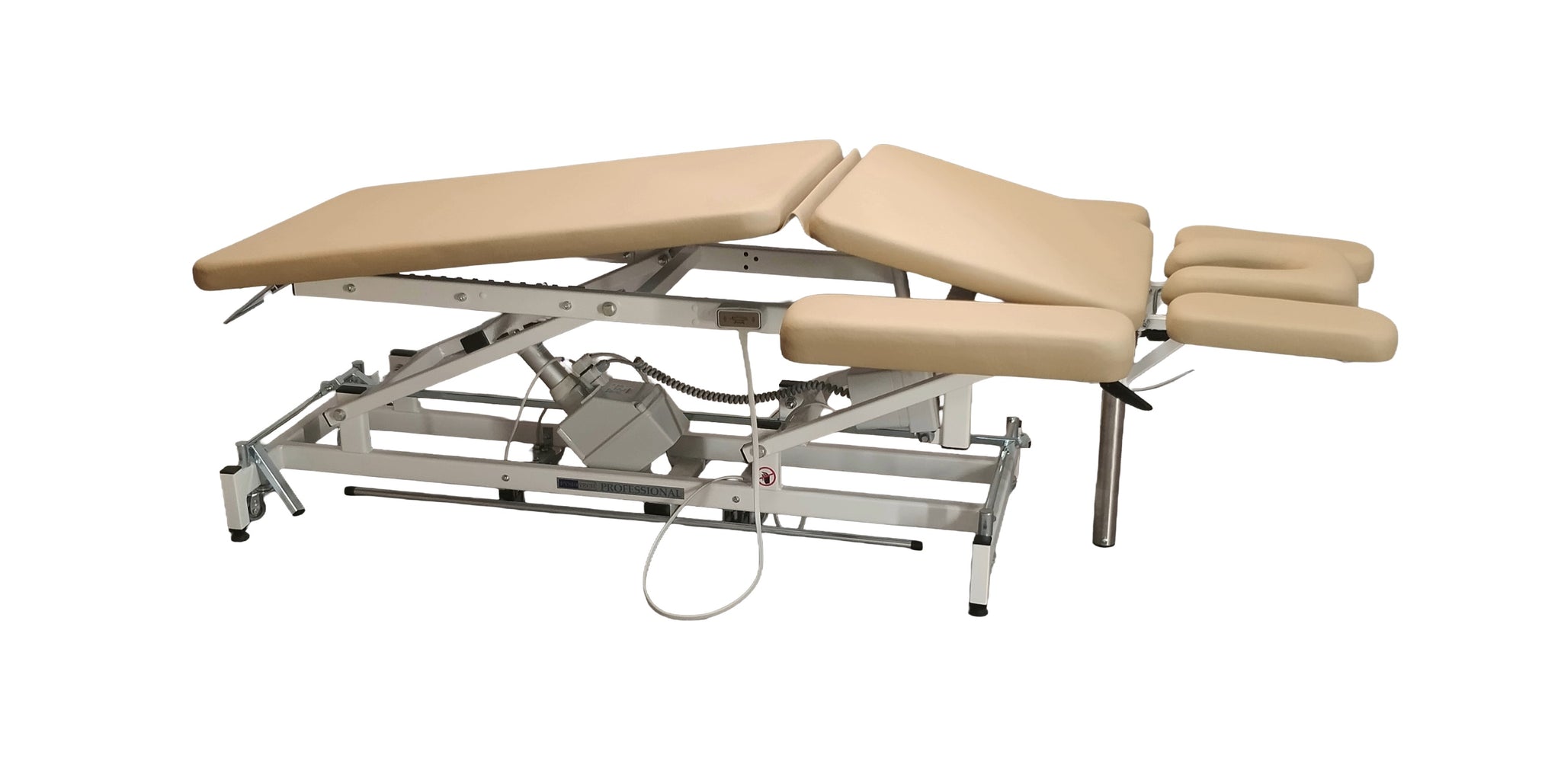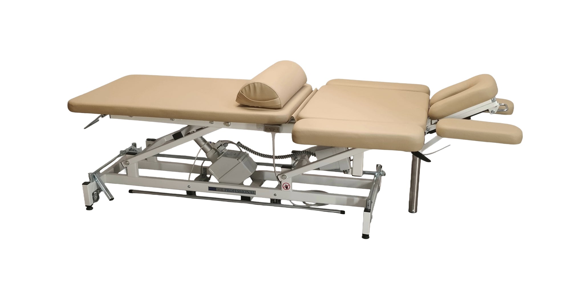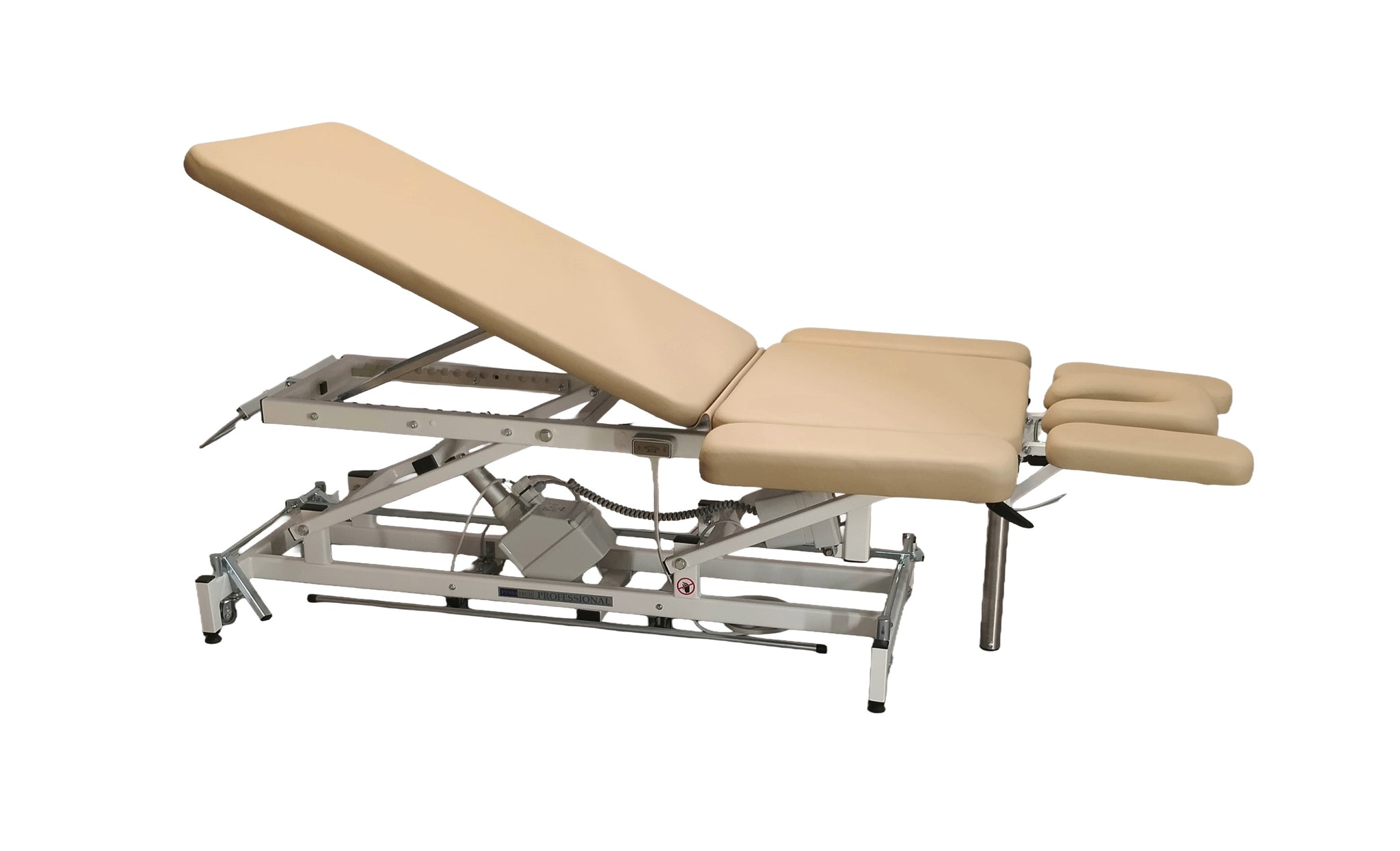 Elektrisk behandlingsbänk med motorlyft, manuell bendel och motoriserat midjelyft. Välj mellan 0, 2 eller 4 sidovingar. Bänken levereras med vitt, grått eller svart stativ och du kan välja mellan 9 färger på klädseln.